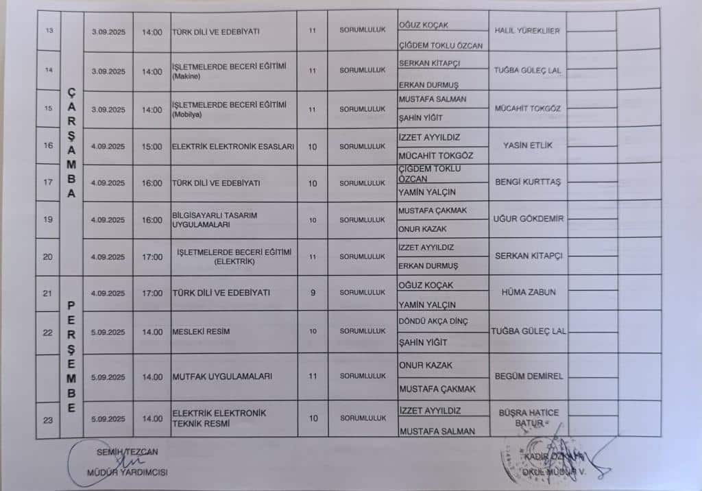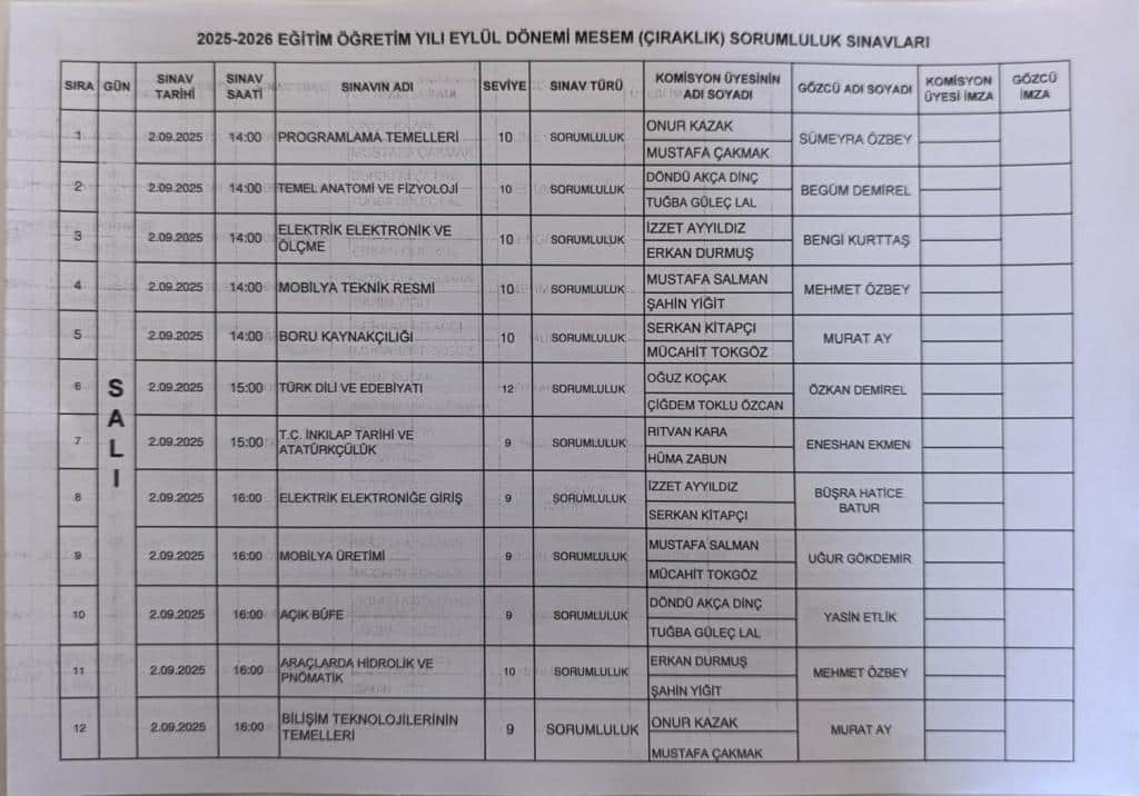 2025-2026 Eğitim Öğretim Yılı Eylül Dönemi MESEM (Çıraklık) Sorumluluk Sınavları
